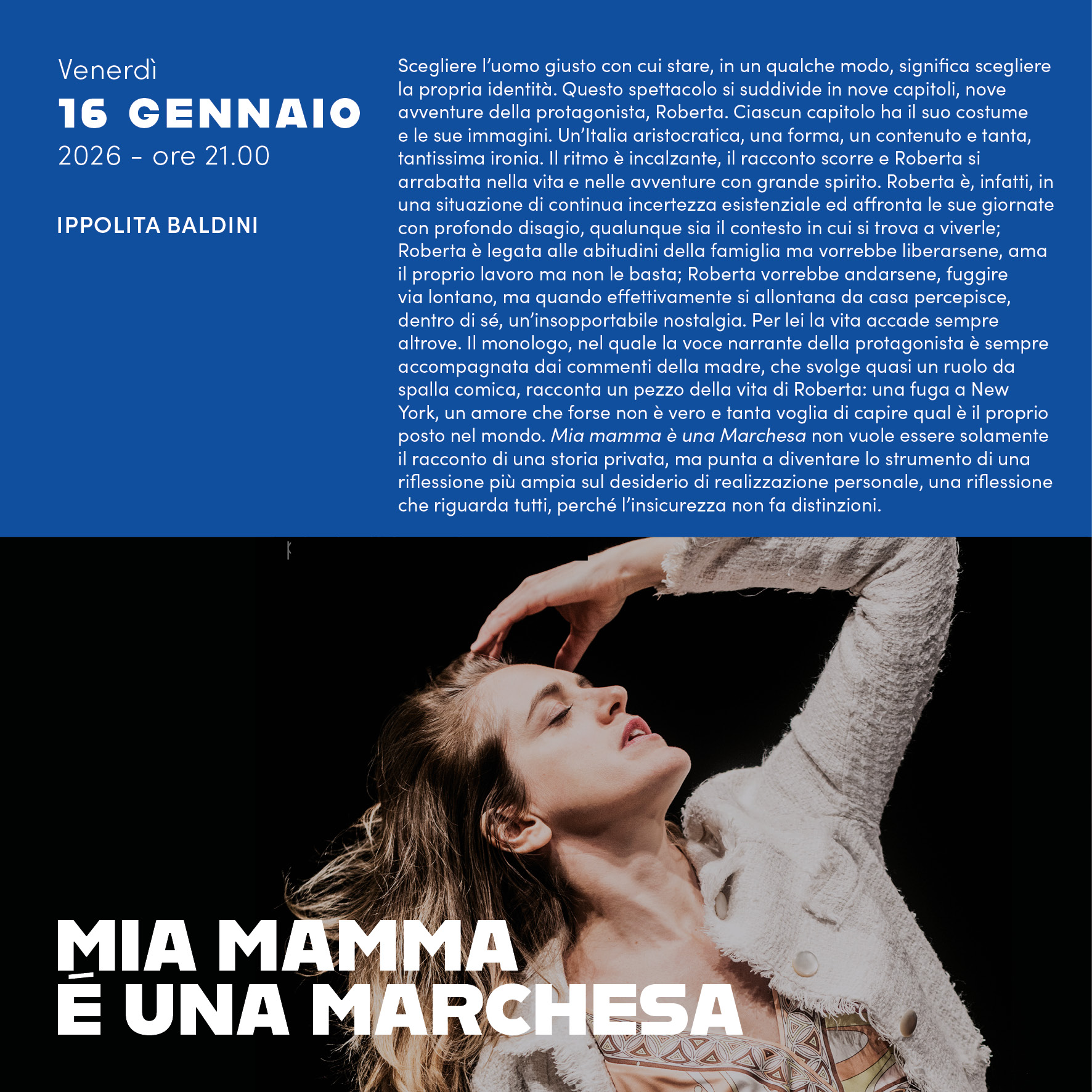 Venerdì 12 Gennaio 2026 alle ore 21.00 si terrà a Palazzo Minerva lo spettacolo "Mia mamma è una Marchesa", con Ippolita Baldini, all'interno della stagione teatrale 2025/2026 di Palazzo Minerva.