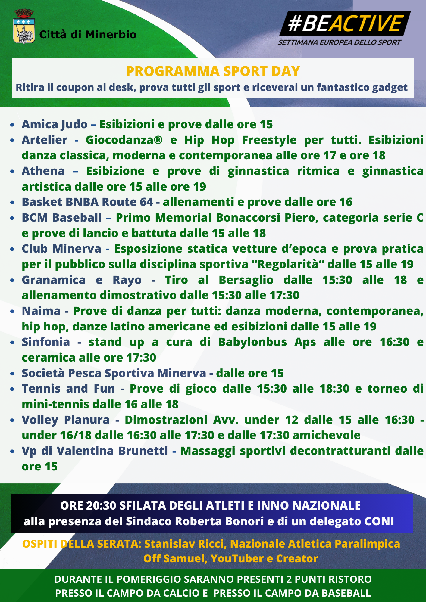 Sabato 23 settembre presso gli Impianti sportivi di Minerbio (via Don Zamboni), dalle ore 15.00 si terrà l’evento Sport Day, organizzato dall’Amministrazione Comunale nell’ambito della Settimana Europea dello Sport 2023, promossa dalla Commissione Europea e coordinata dall’Ufficio per lo sport della Presidenza del Consiglio dei Ministri.