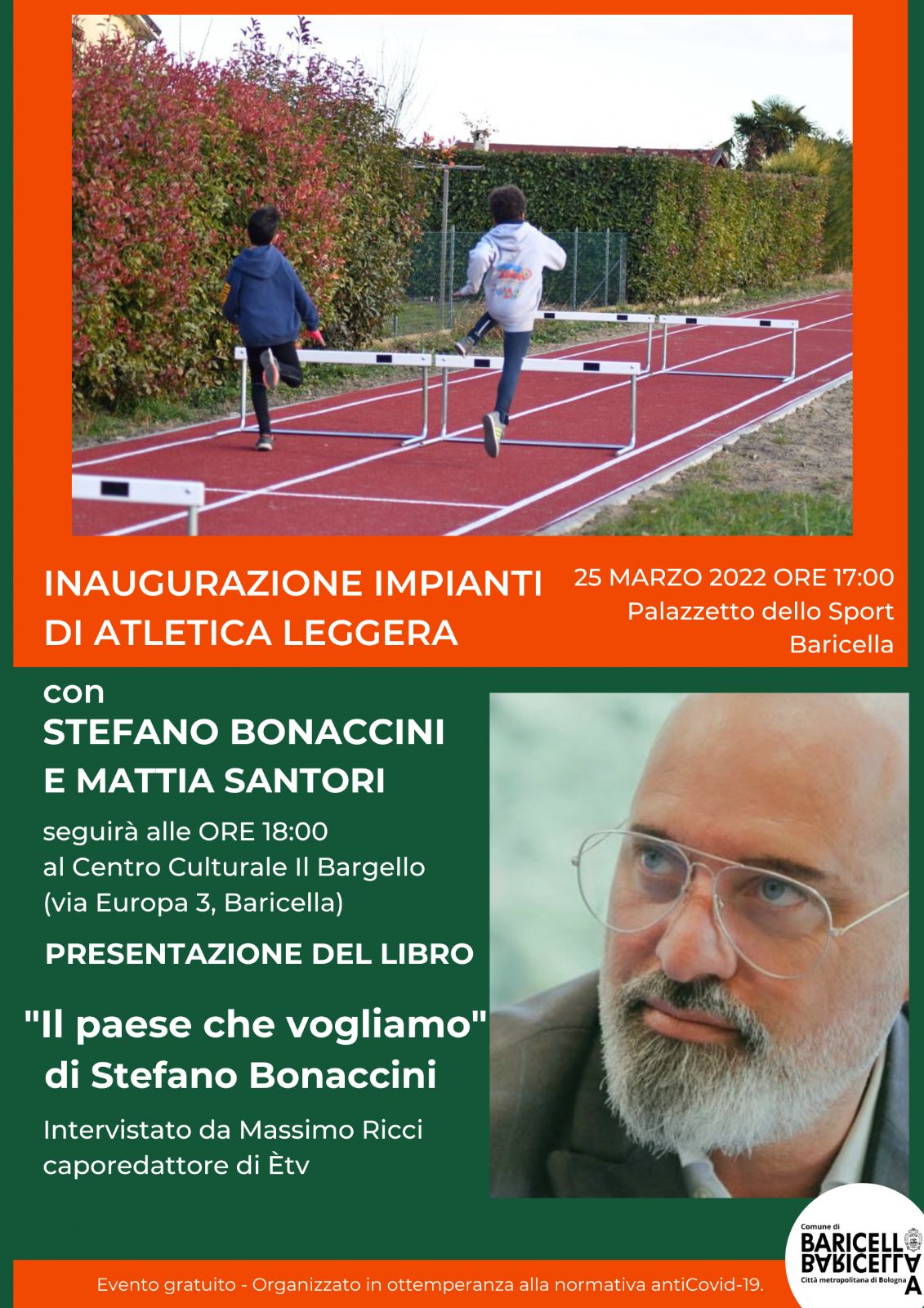 Venerdì alle ore 17:00 presso il Palazzetto dello Sport di Baricella inauguriamo gli impianti di atletica con Stefano Bonaccini, presidente della Regione, e Mattia Santori , consigliere comunale a Bologna.