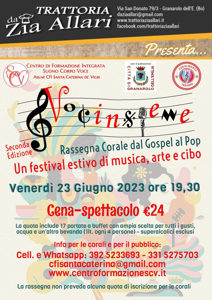 Si rinnova Venerdì 23 giugno alle 19,30 un’iniziativa tutta da ascoltare e da gustare! La Seconda Edizione della Rassegna “Vocinsieme” dedicata alle corali con repertorio pop-gospel e al connubio tra gastronomia e musica, organizzata dal Centro di Formazione Integrata “Suono Corpo Voce”, in collaborazione con il Ristorante-Trattoria "Da Zia Allari" e con il Patrocinio del Comune di Granarolo dell'Emilia.